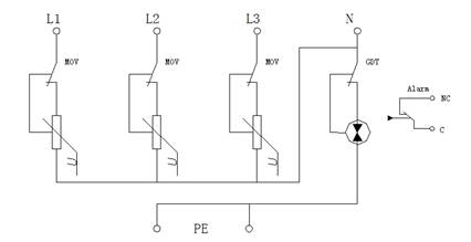 DXH06-FC621/3+1交流電源電涌保護(hù)器用于交流電源的第二級(jí)(C級(jí))雷電過(guò)電壓保護(hù),采用3+1防護(hù)電路,如下列圖形所示。