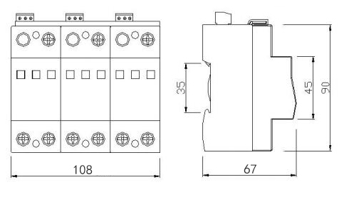 產(chǎn)品采用 35mm 標準導(dǎo)軌安裝,單模尺寸為:90×67×108(mm),未標注公差:±1mm。如下列圖所示(單位:mm):